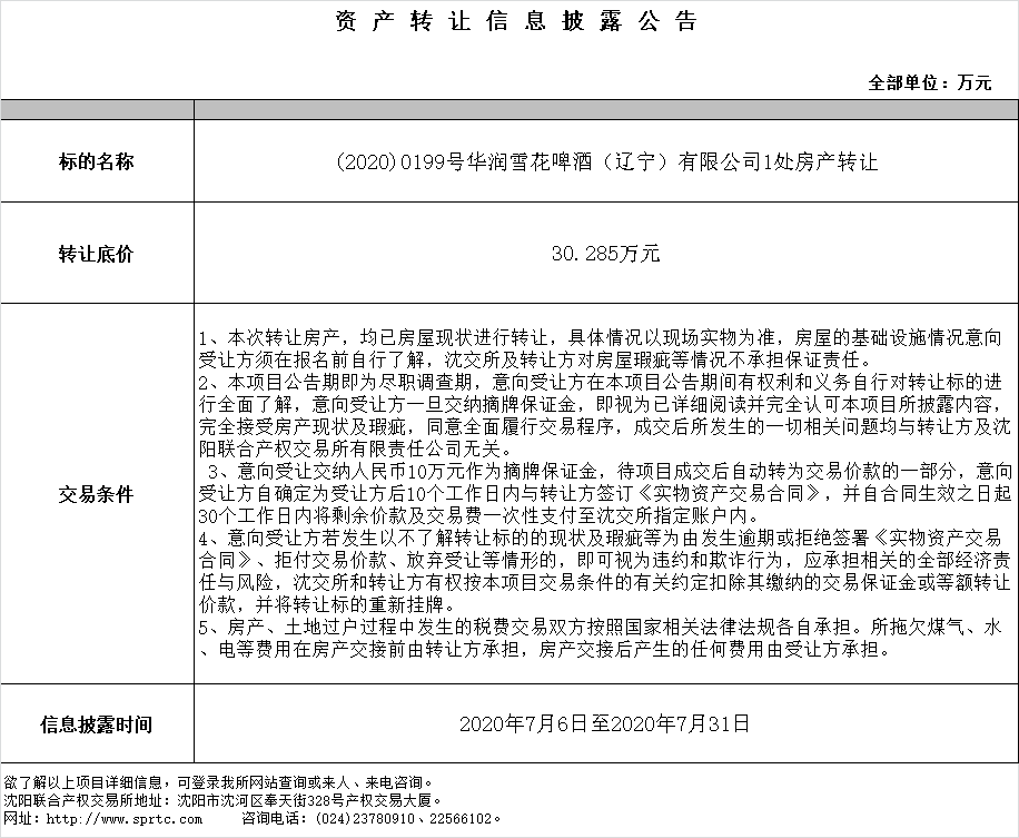 華潤(rùn)雪花啤酒(遼寧)有限公司轉(zhuǎn)讓沈陽(yáng)市和平區(qū)安圖北街2號(hào)(7-5-1)房產(chǎn)