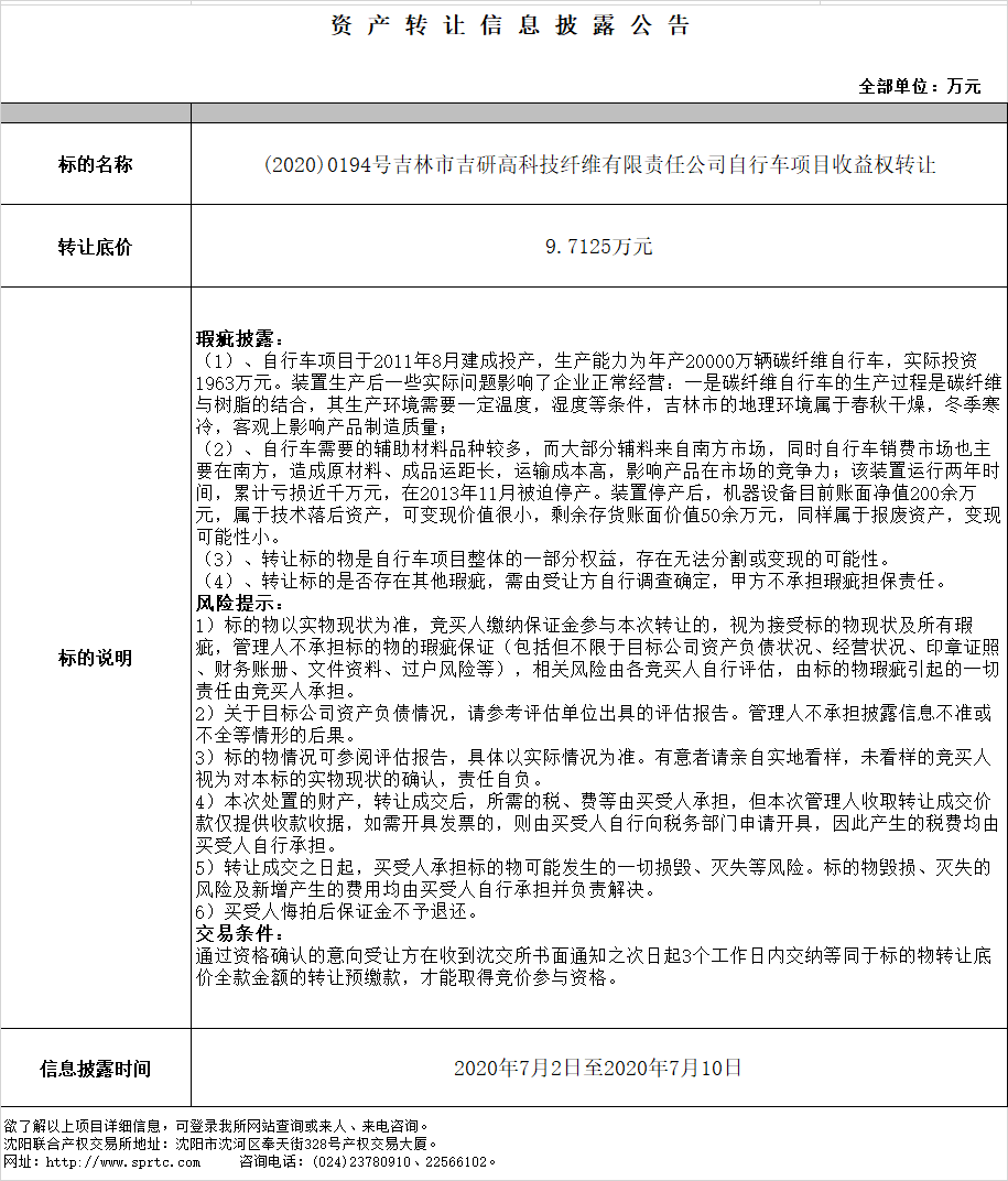 吉研高科技纖維有限責(zé)任公司23.34% 自行車項目收益權(quán)轉(zhuǎn)讓