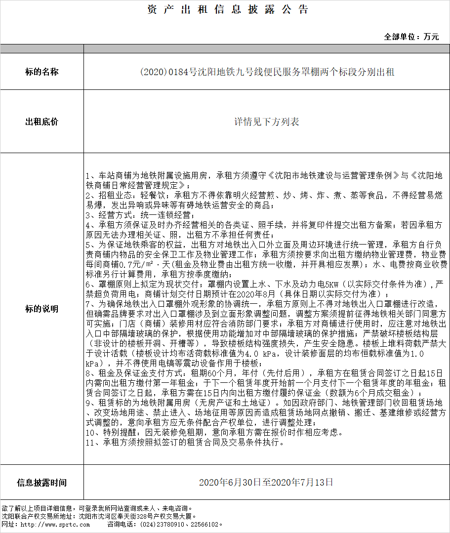 沈陽地鐵9號線7處便民服務罩棚出租(租期5年)