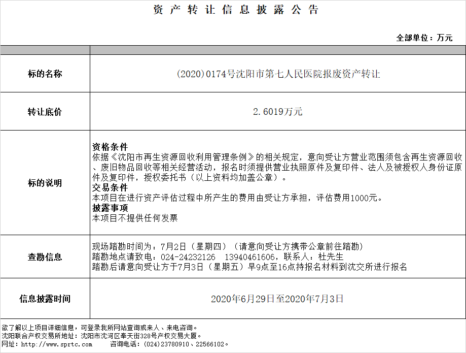 沈陽市第七人民醫(yī)院報廢資產(chǎn)轉(zhuǎn)讓。