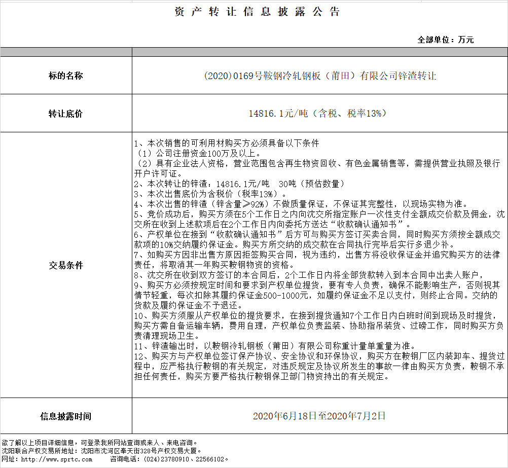 鞍鋼冷軋鋼板(莆田)有限公司鋅渣轉(zhuǎn)讓