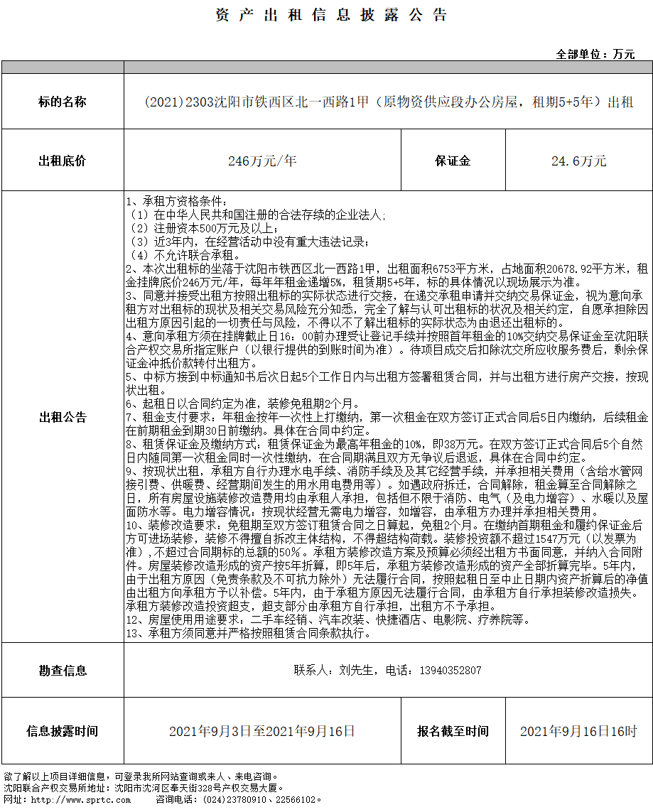 沈陽市鐵西區(qū)北一西路1甲出租(原物資供應(yīng)段辦公房屋,租期5+5年)
