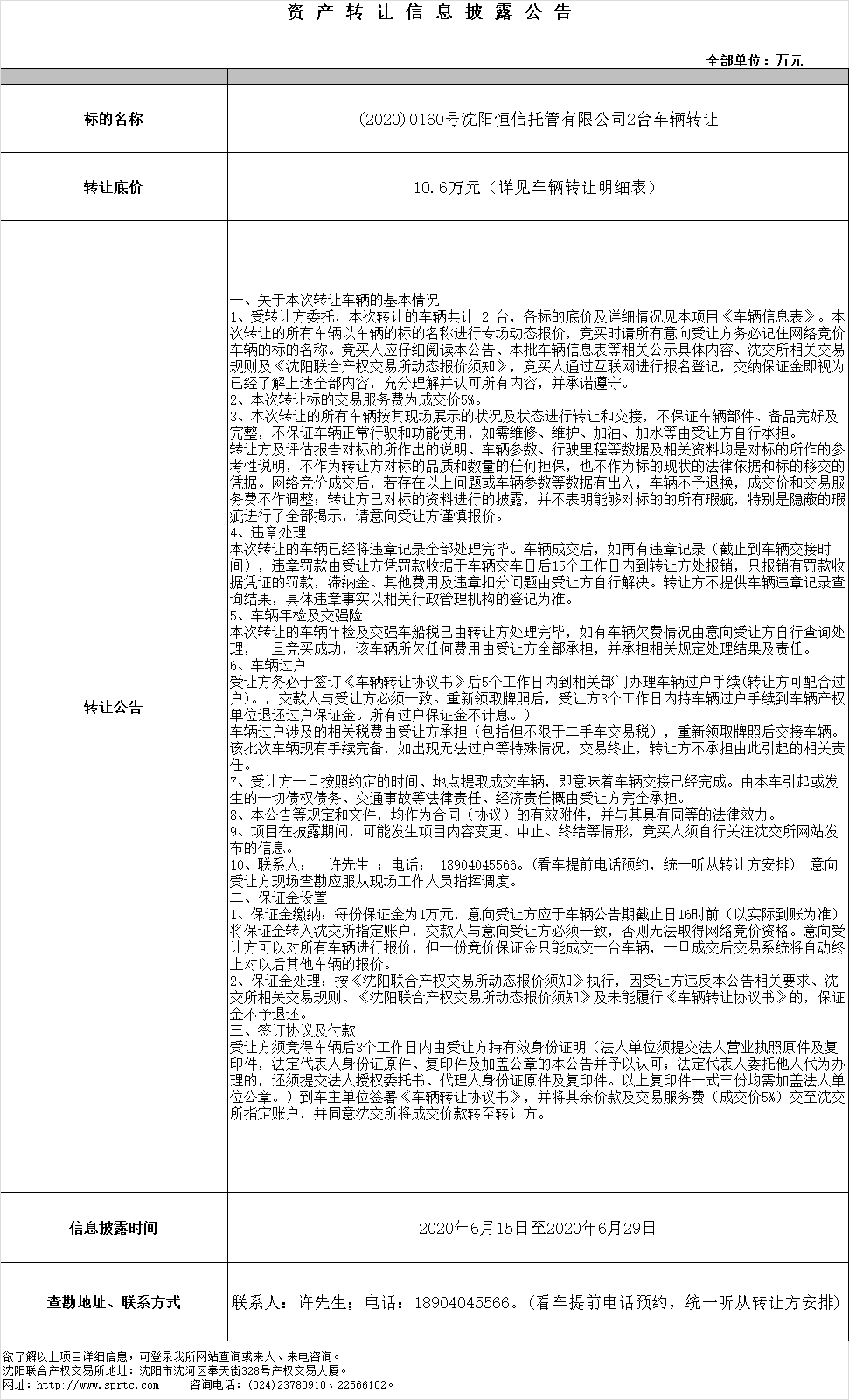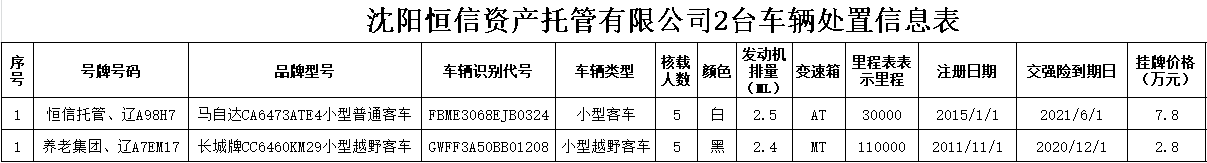 (2020)0160號沈陽恒信托管有限公司2臺車輛轉(zhuǎn)讓