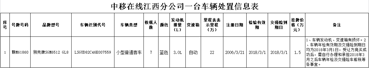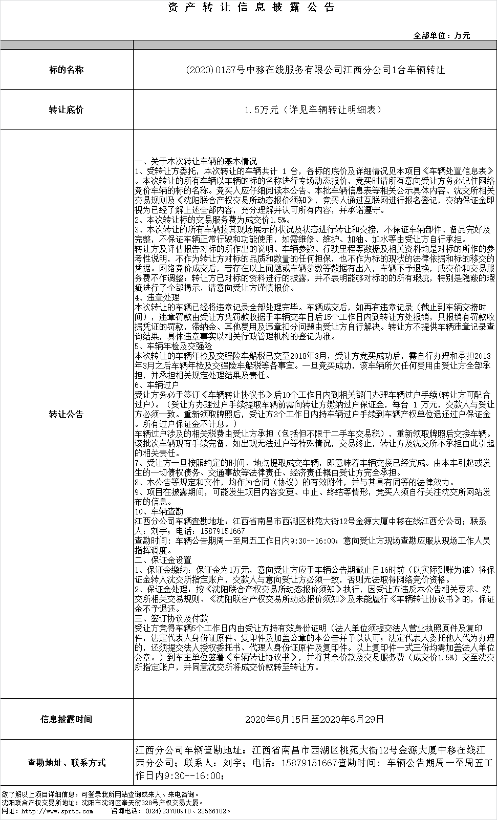 (2020)0157號中移在線服務(wù)有限公司江西分公司1臺車輛轉(zhuǎn)讓