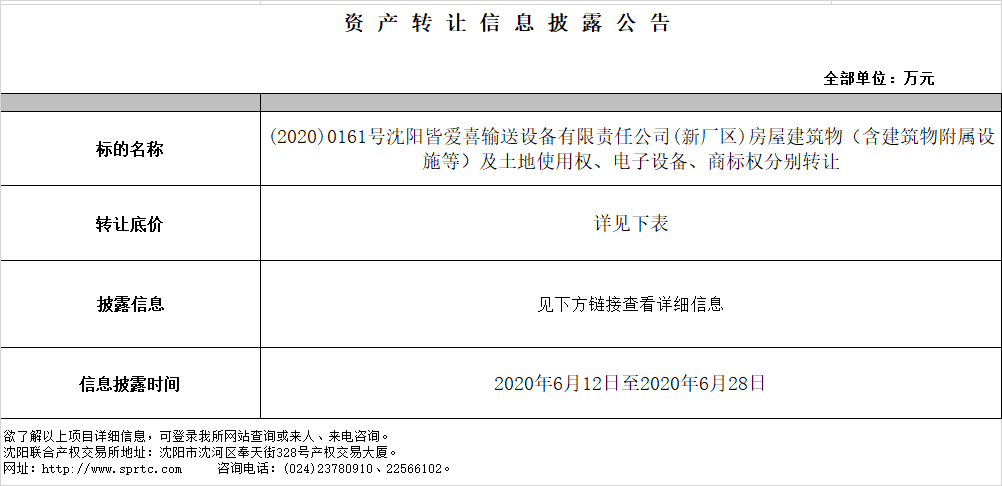 沈陽皆愛喜輸送設備有限責任公司(新廠區(qū))房屋建筑物(含建筑物附屬設施等)及土地使用權轉讓