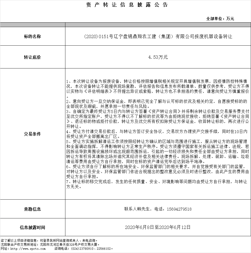 遼寧盤錦鼎翔農(nóng)工建集團(tuán)有限公司報(bào)廢機(jī)器設(shè)備轉(zhuǎn)讓。