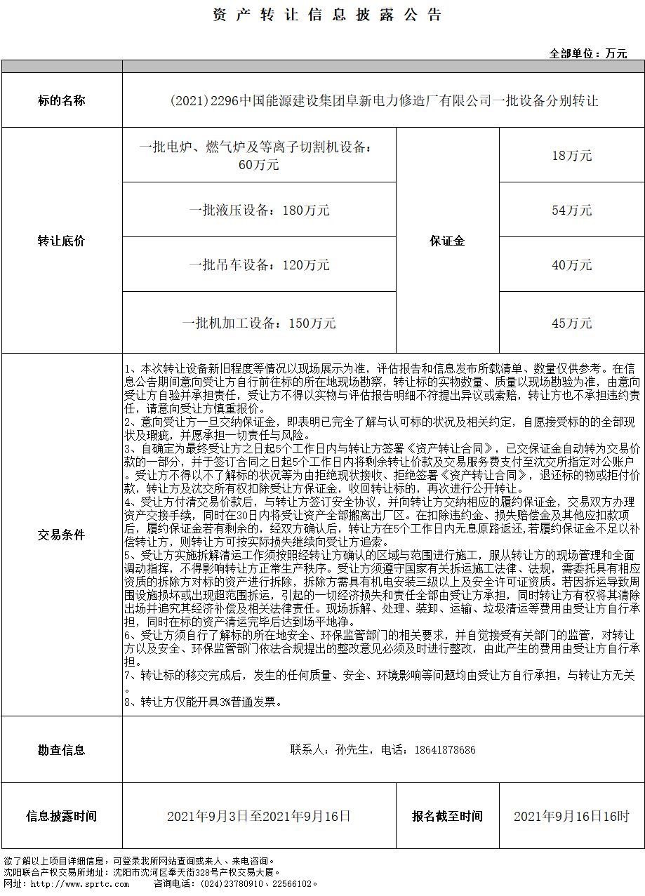 中國能源建設(shè)集團(tuán)阜新電力修造廠有限公司一批電爐、燃?xì)鉅t及等離子切割機(jī)設(shè)備轉(zhuǎn)讓