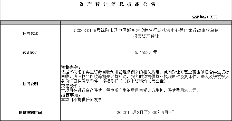(2020)0148號沈陽市遼中區(qū)城鄉(xiāng)建設(shè)綜合行政執(zhí)法中心等11家行政事業(yè)單位報廢資產(chǎn)轉(zhuǎn)讓