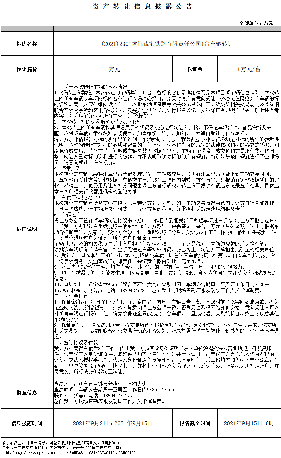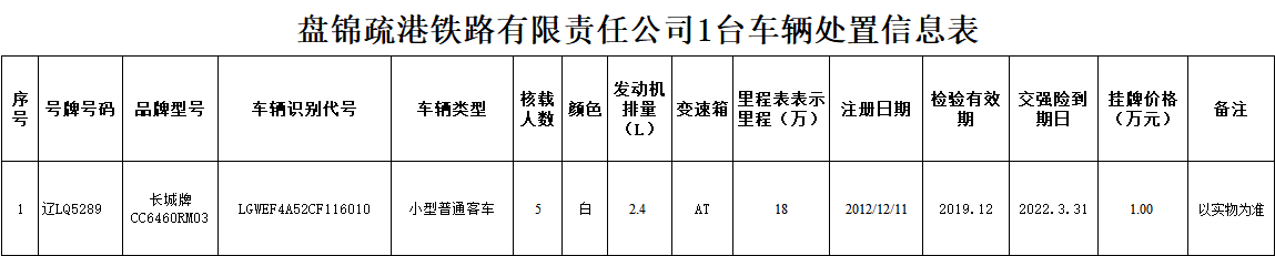 盤錦疏港鐵路有限責(zé)任公司1臺(tái)車輛轉(zhuǎn)讓