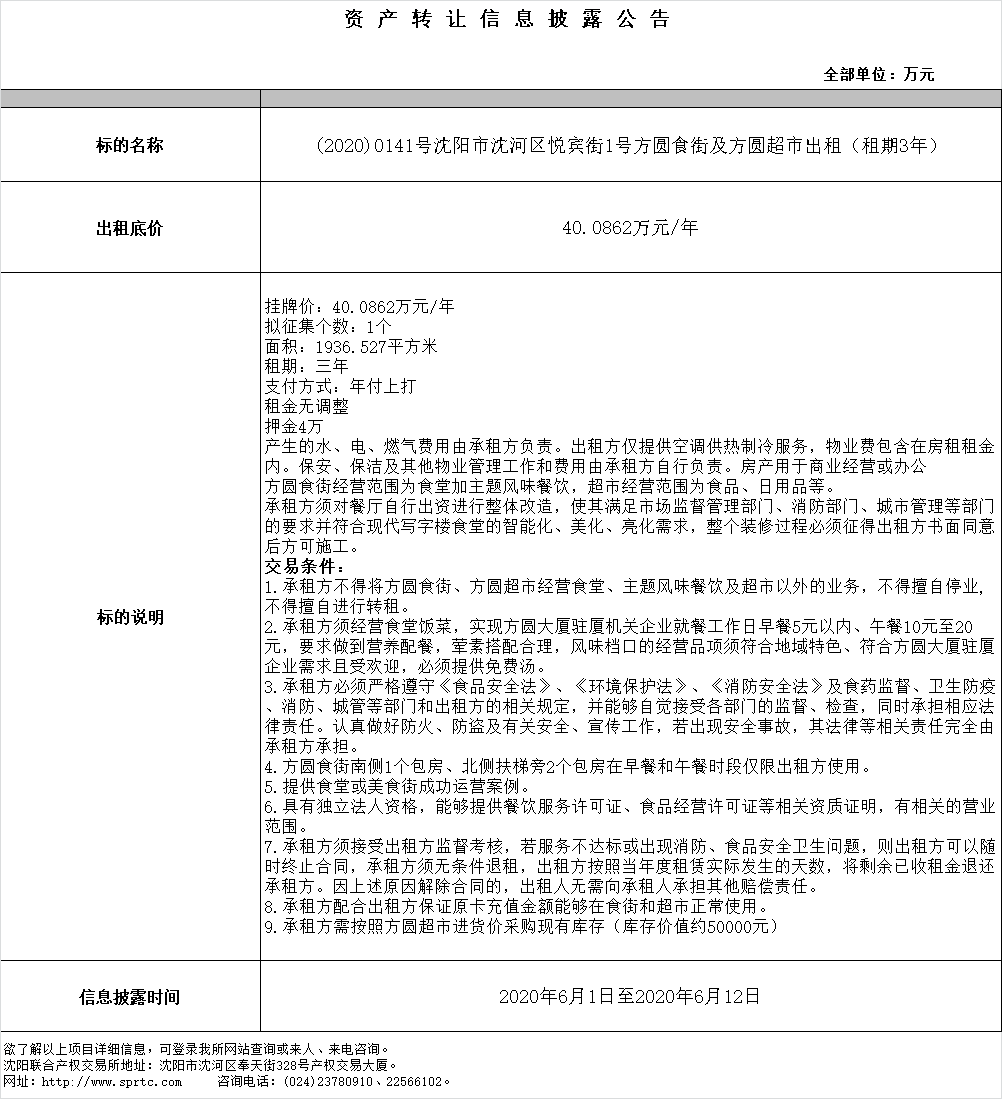 沈陽市沈河區(qū)悅賓街1號方圓食街及方圓超市出租 (租期3年)。