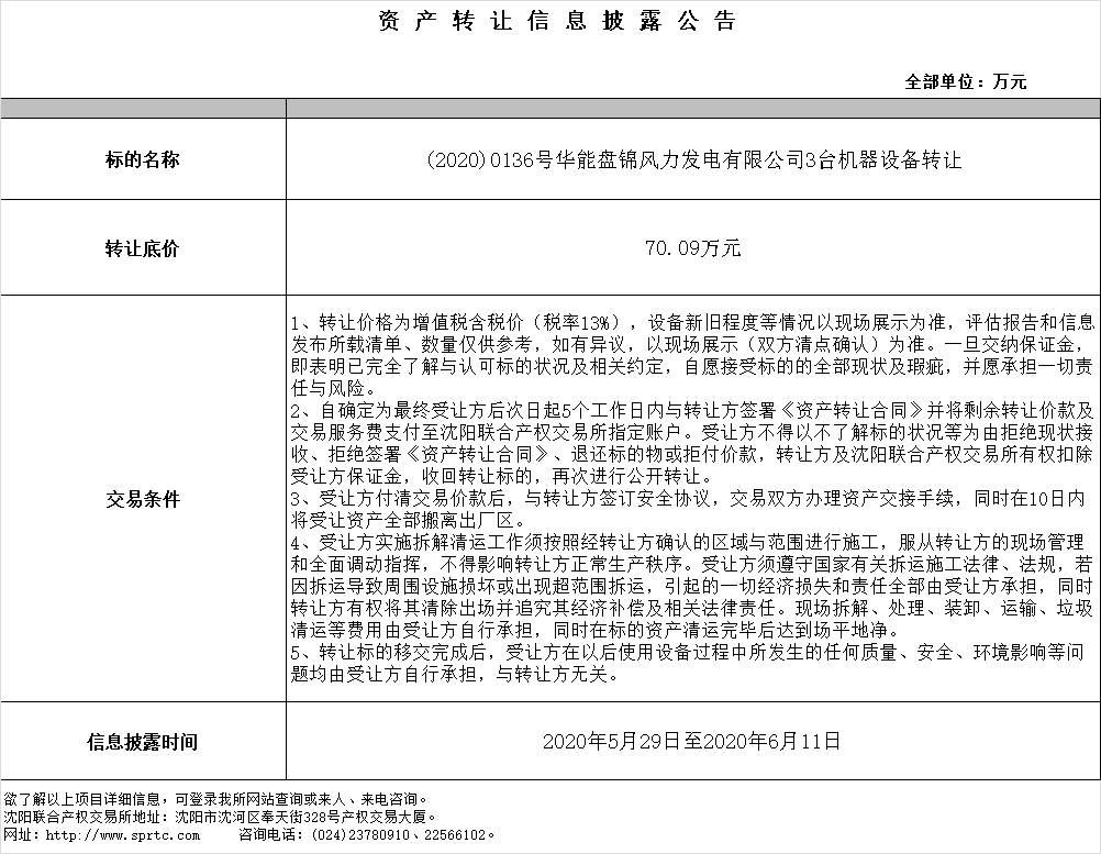 華能盤錦風力發(fā)電有限公司3臺機器設(shè)備轉(zhuǎn)讓。