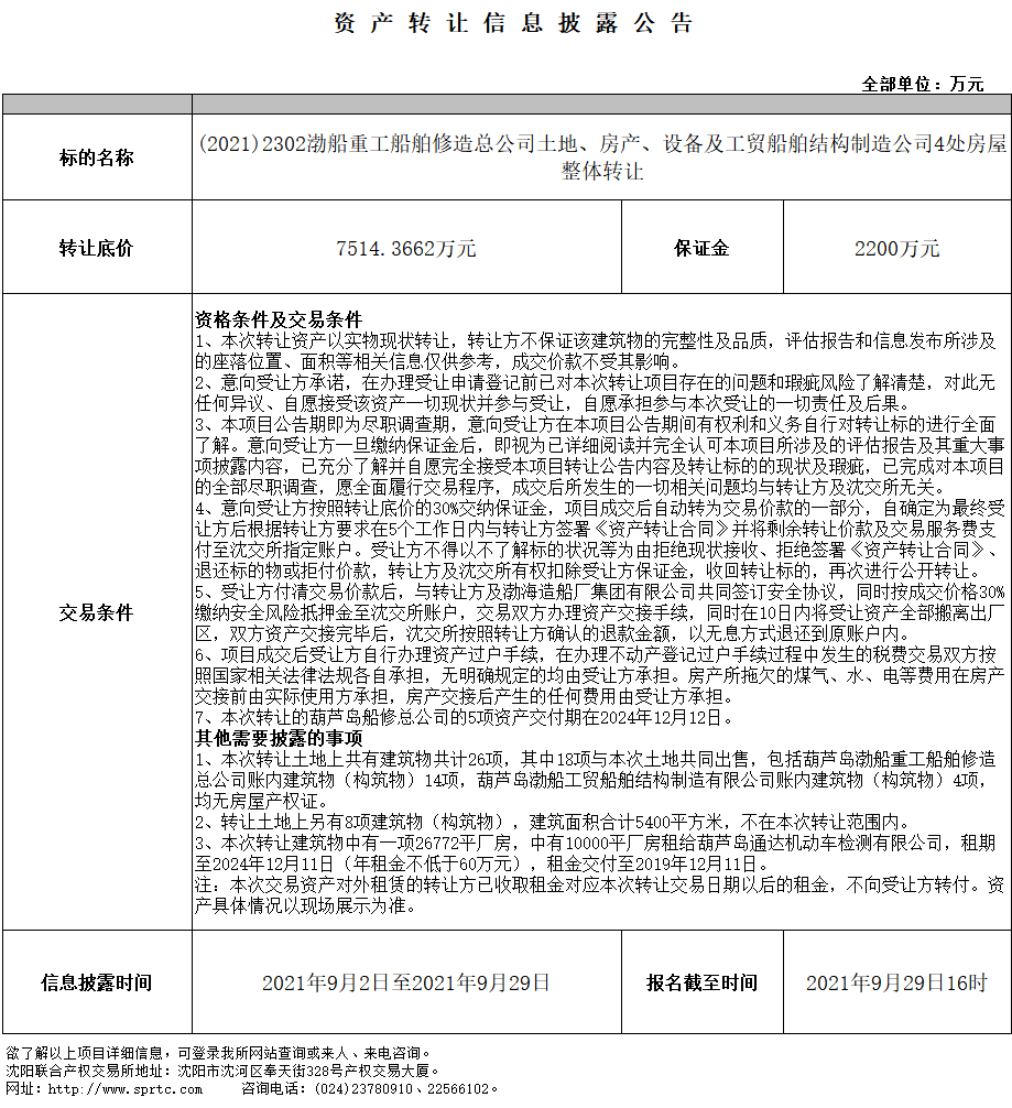 渤船重工船舶修造總公司土地、房產(chǎn)、設(shè)備及工貿(mào)船舶結(jié)構(gòu)制造公司4處房屋整體轉(zhuǎn)讓
