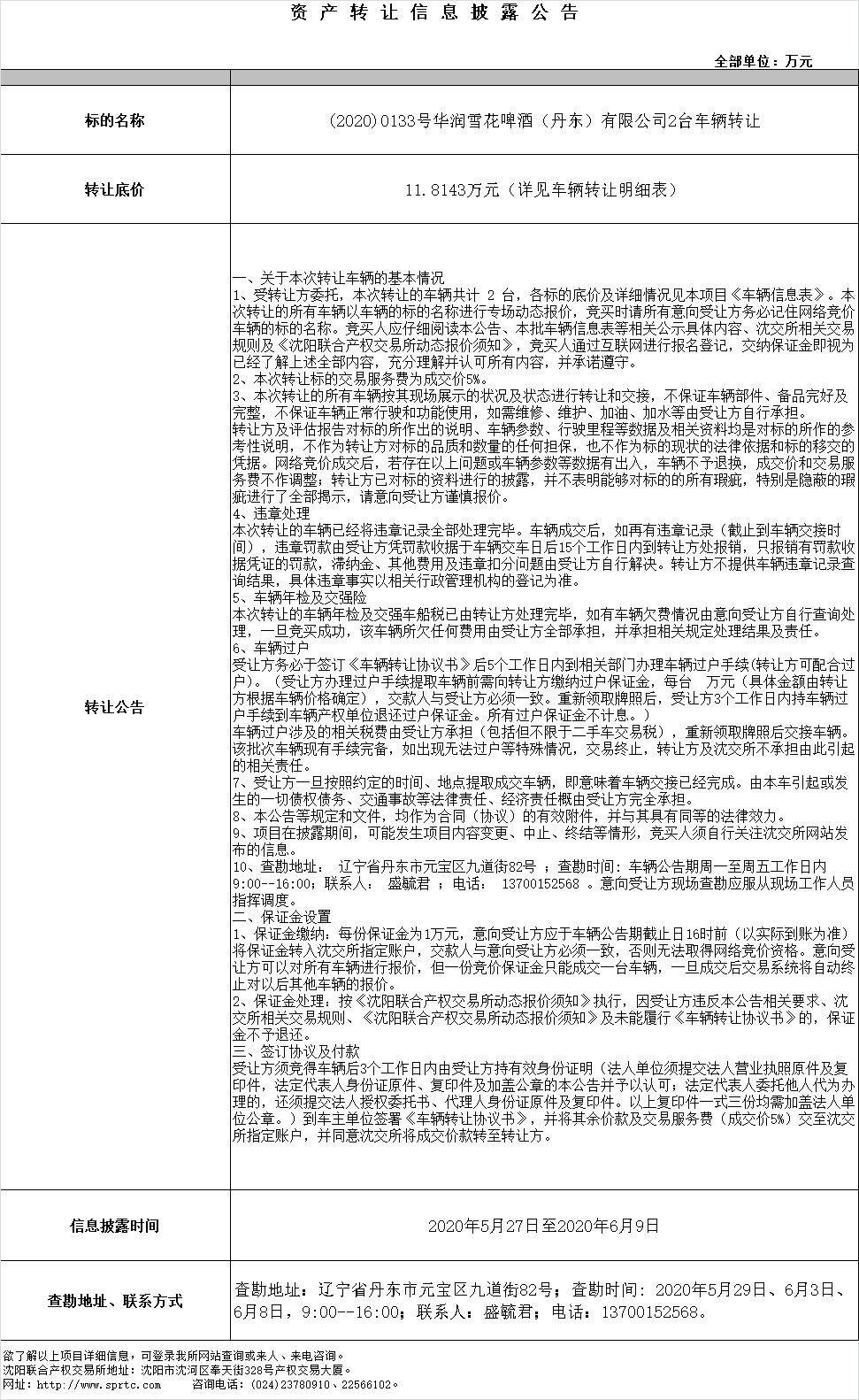 (2020)0133號華潤雪花啤酒(丹東)有限公司2臺車輛轉(zhuǎn)讓