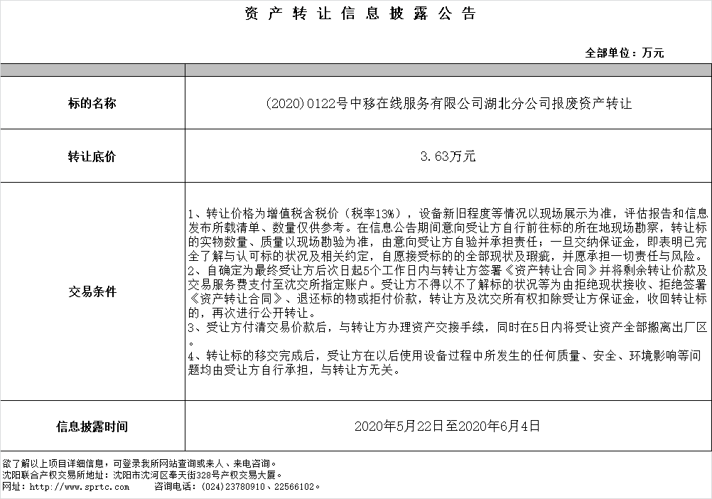 中移在線服務(wù)有限公司湖北分公司處置清單;