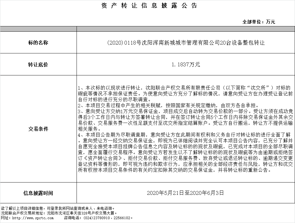 (2020)0118號(hào)沈陽(yáng)渾南新城城市管理有限公司20臺(tái)設(shè)備整包轉(zhuǎn)讓