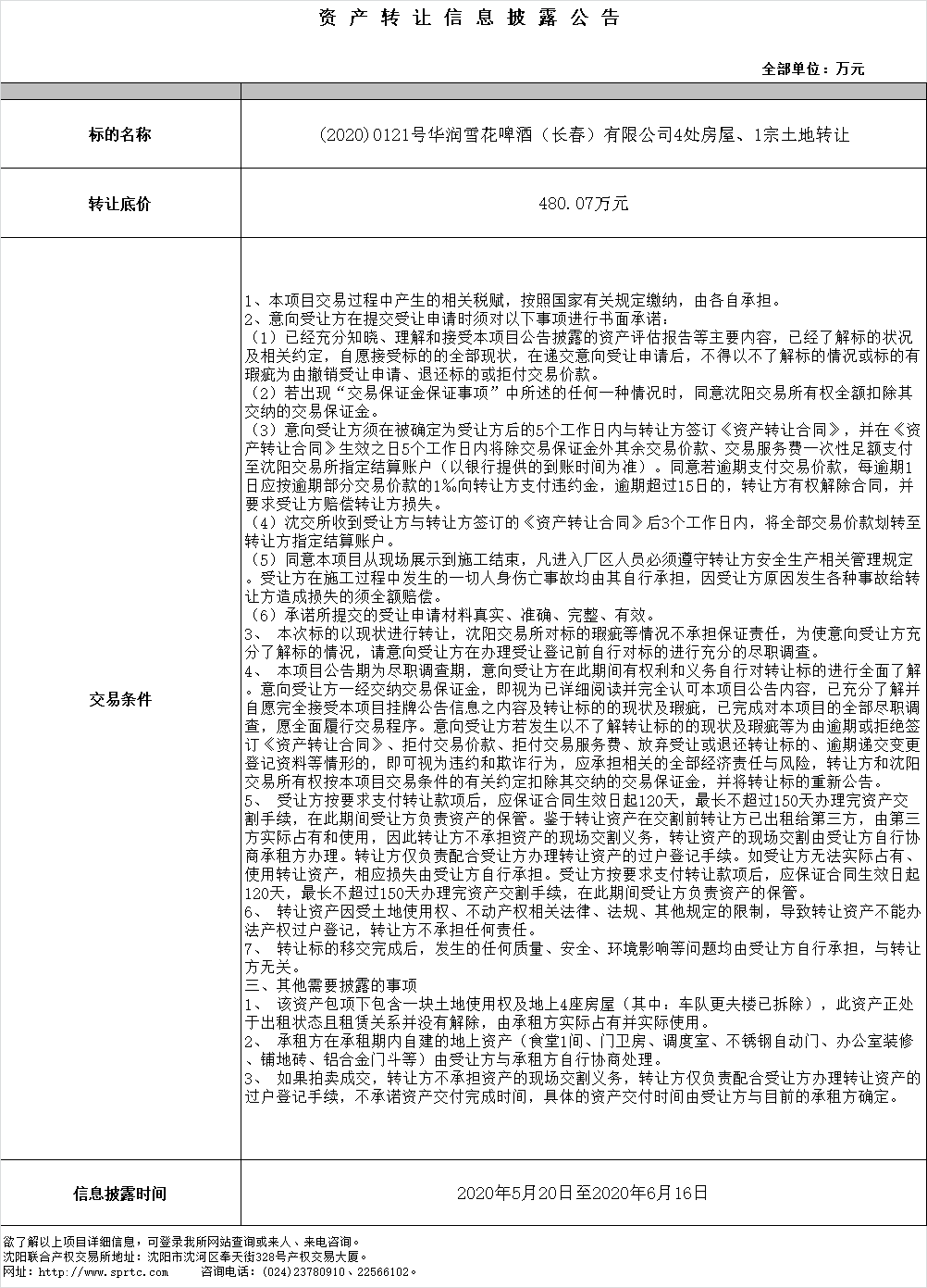 華潤雪花啤酒(長春)有限公司4處房屋、1宗土地轉(zhuǎn)讓。