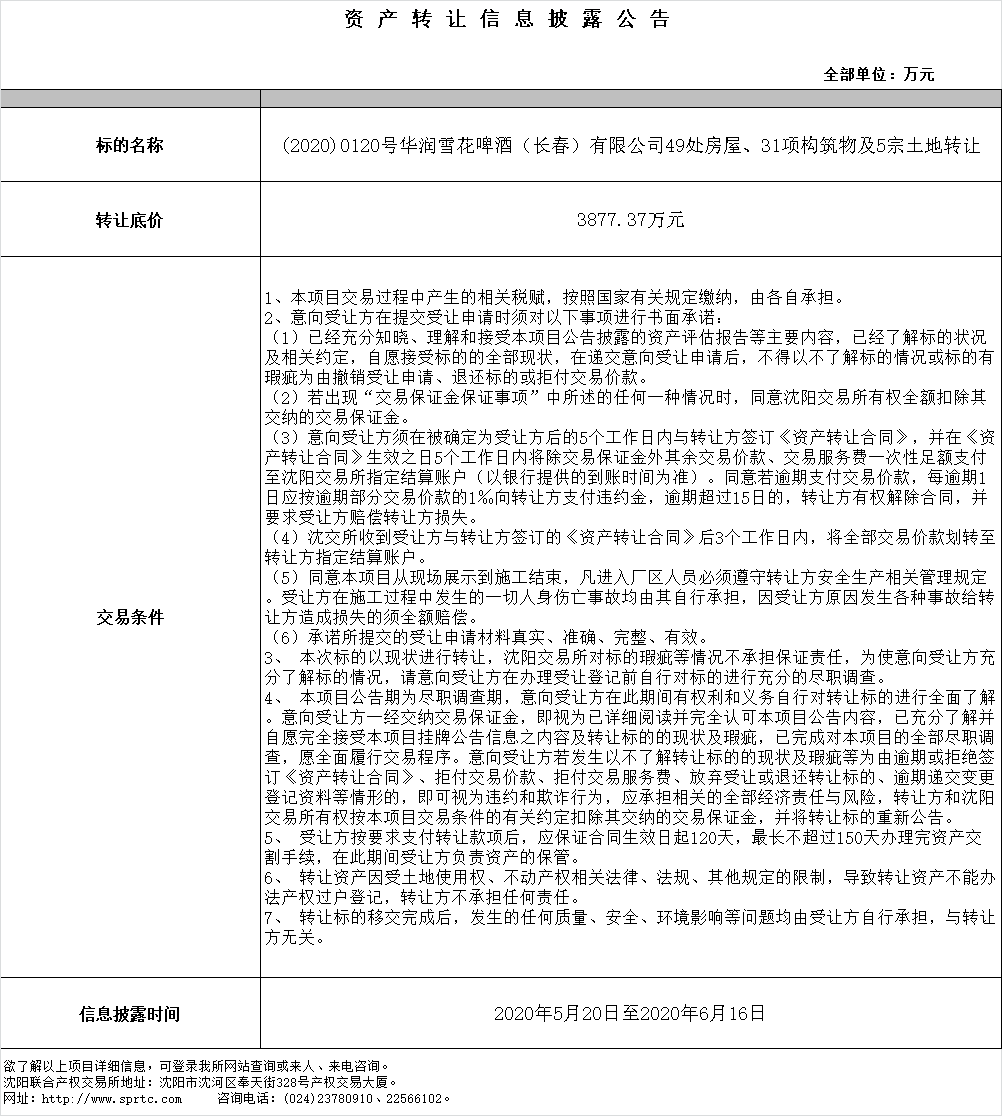華潤(rùn)雪花啤酒(長(zhǎng)春)有限公司49處房屋、31項(xiàng)構(gòu)筑物及5宗土地轉(zhuǎn)讓。