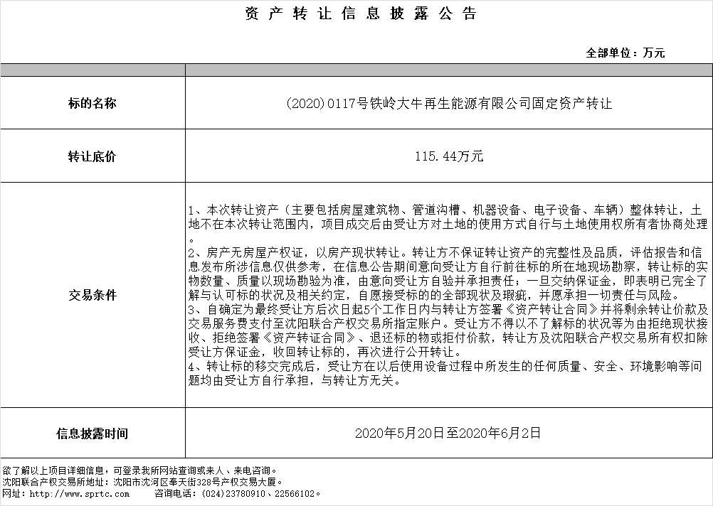 (2020)0117號鐵嶺大牛再生能源有限公司固定資產轉讓