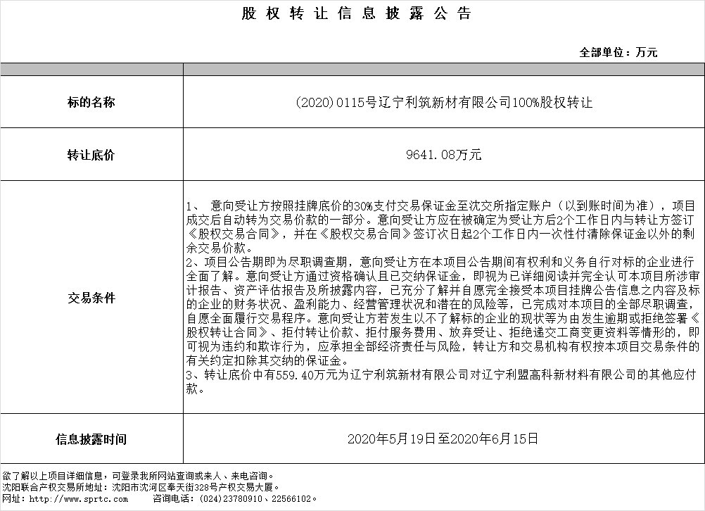 遼寧利筑新材有限公司100%股權(quán)轉(zhuǎn)讓。
