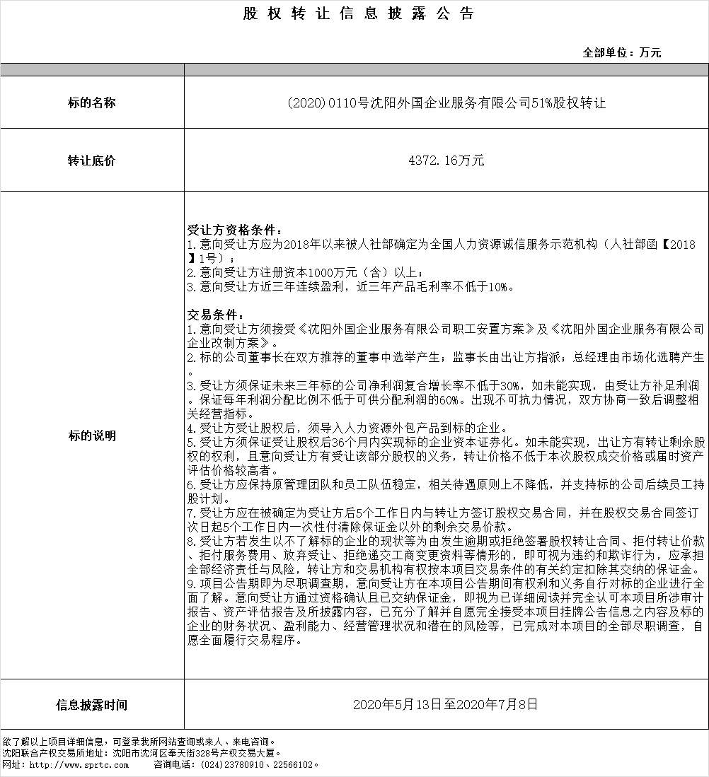 沈陽外國企業(yè)服務(wù)有限公司51%股權(quán)轉(zhuǎn)讓。