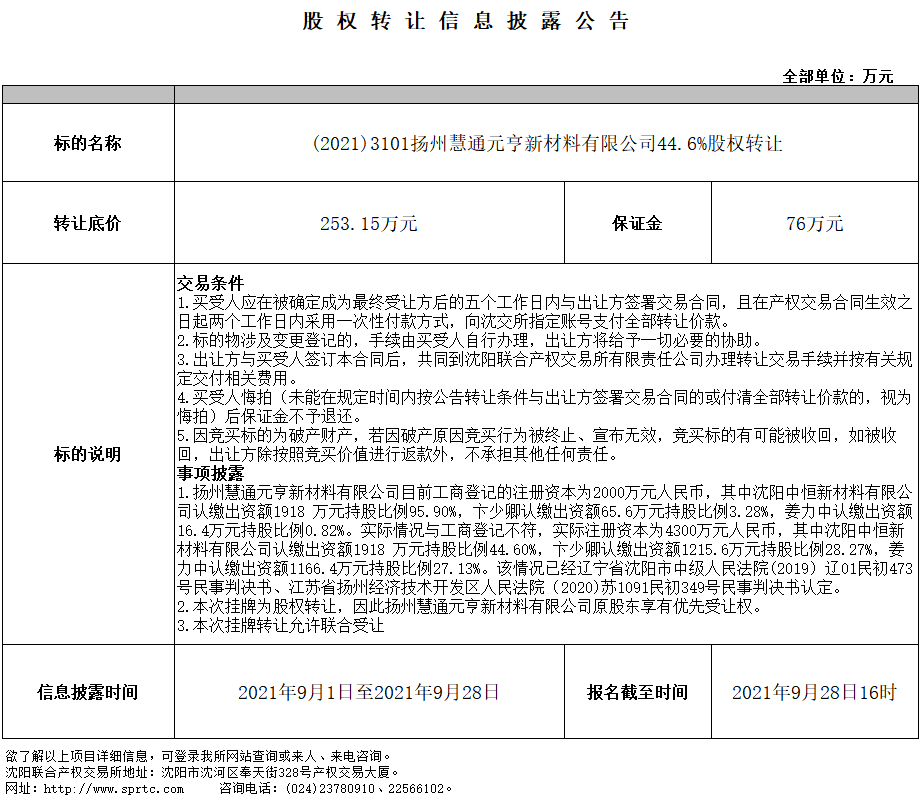 揚(yáng)州慧通元亨新材料有限公司44.6%股權(quán)轉(zhuǎn)讓