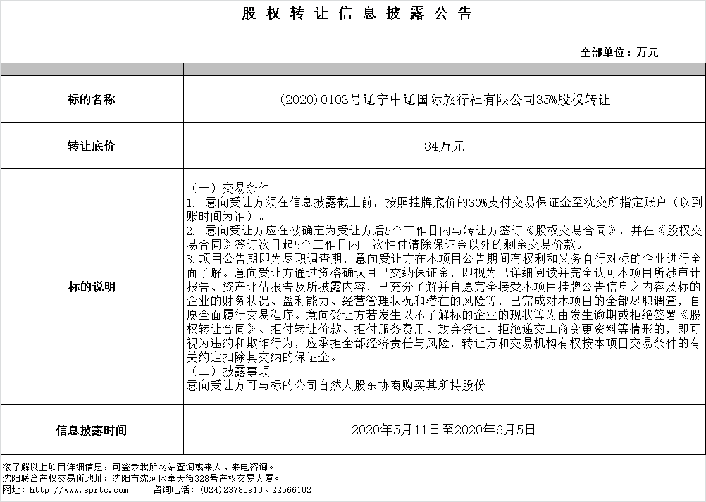 遼寧中遼國際旅行社有限公司35%股權(quán)轉(zhuǎn)讓。