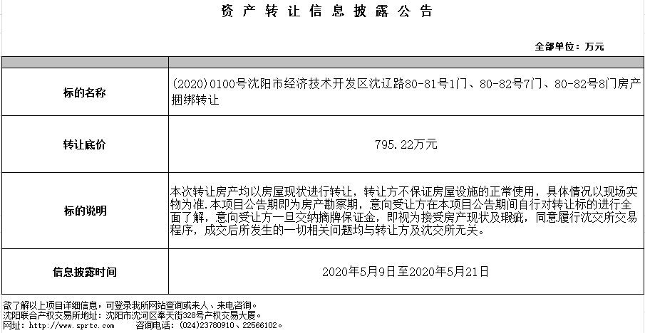 沈陽(yáng)市經(jīng)濟(jì)技術(shù)開發(fā)區(qū)沈遼路80-81號(hào)1門、80-82號(hào)7門、80-82號(hào)8門房產(chǎn)捆綁轉(zhuǎn)讓。