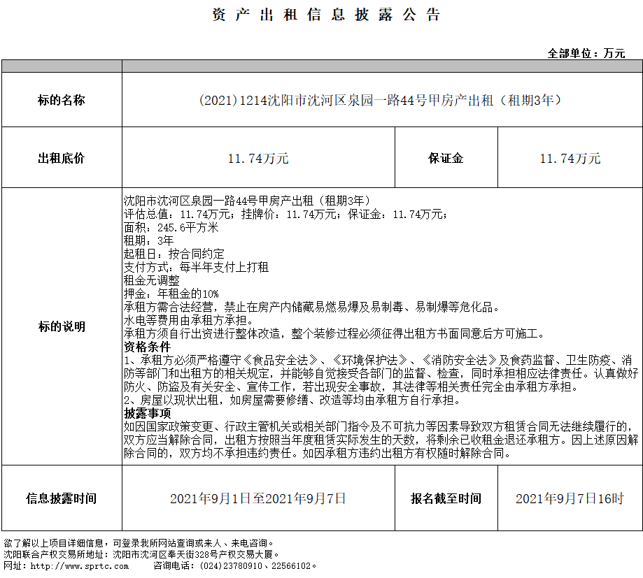 沈陽(yáng)市沈河區(qū)泉園一路44號(hào)房產(chǎn)出租(租期3年)