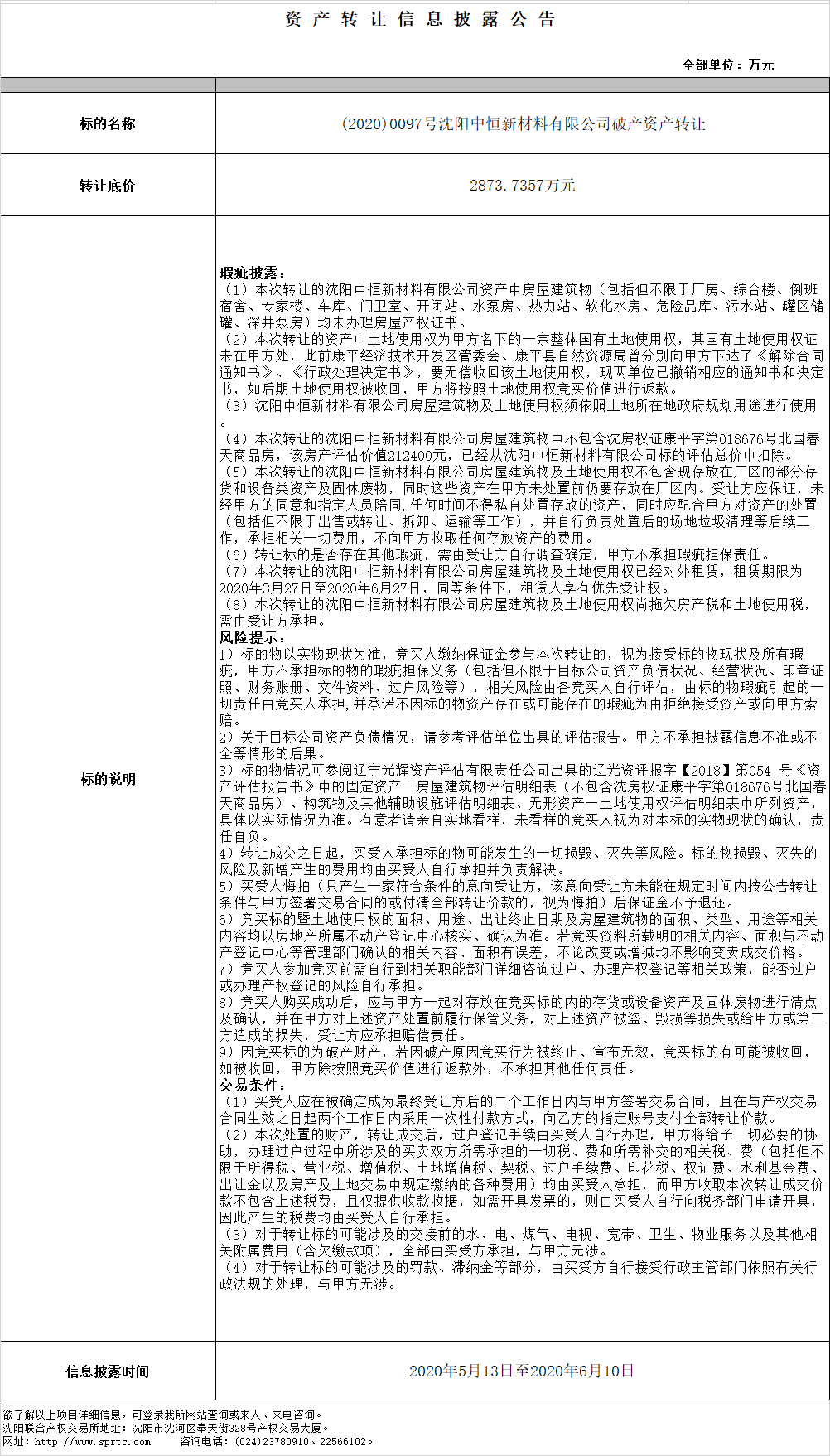 沈陽中恒新材料有限公司房屋建筑物、土地使用權(quán)轉(zhuǎn)讓。