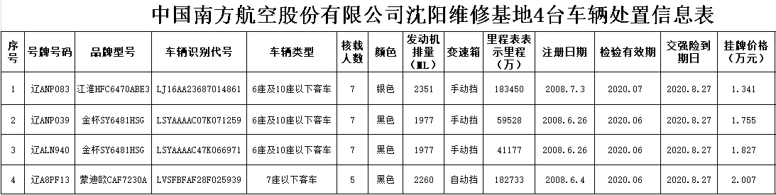 (2020)0089號中國南方航空股份有限公司沈陽維修基地4臺車輛分別轉讓