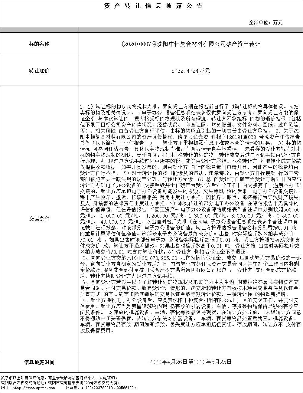 沈陽中恒復(fù)合材料有限公司房屋建筑物、土地使用權(quán) 、電子辦公設(shè)備。