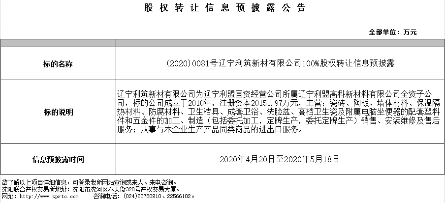 遼寧利筑新材有限公司100%股權(quán)轉(zhuǎn)讓預(yù)披露。