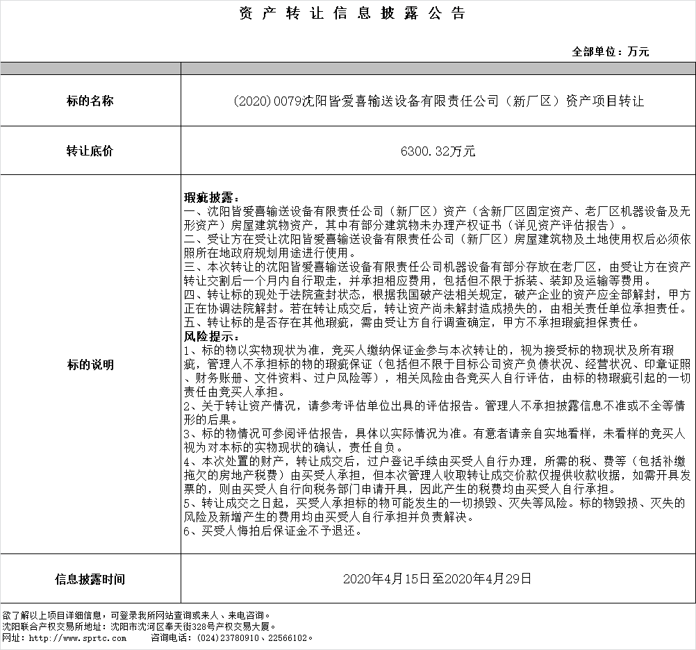 沈陽皆愛喜輸送設備有限責任公司(新廠區(qū))資產(chǎn)(含新廠區(qū)固定資產(chǎn)、老廠區(qū)機器設備及無形資產(chǎn))。
