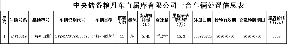 (2020)0059號(hào)中央儲(chǔ)備糧丹東直屬庫(kù)有限公司1臺(tái)車(chē)輛轉(zhuǎn)讓