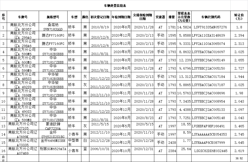 (2020)0023號(hào)中國(guó)南方航空股份有限公司北方分公司16臺(tái)車(chē)輛分別轉(zhuǎn)讓