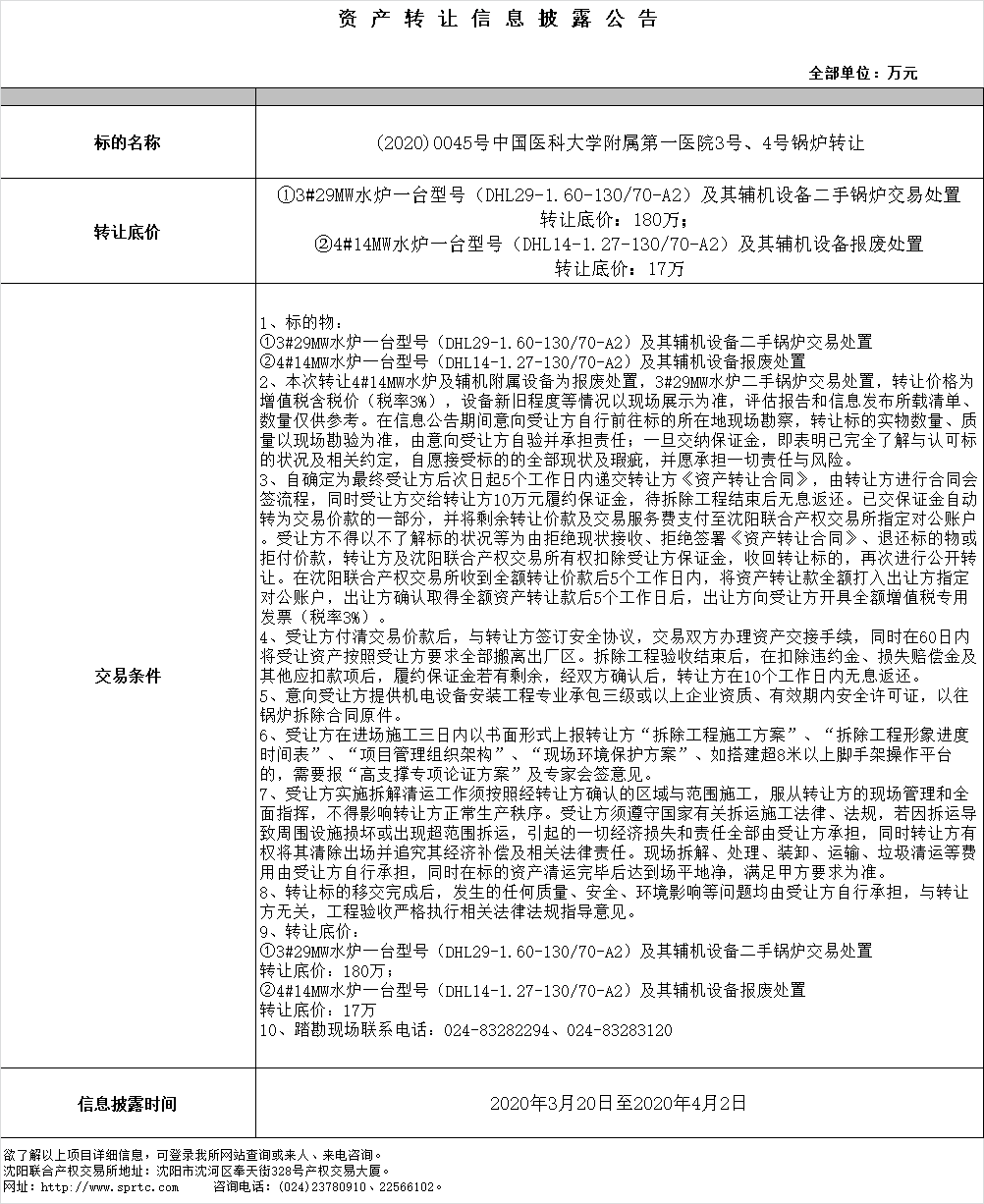 中國(guó)醫(yī)科大學(xué)附屬第一醫(yī)院4號(hào)14MW燃煤熱水鍋爐報(bào)廢拆除轉(zhuǎn)讓。
