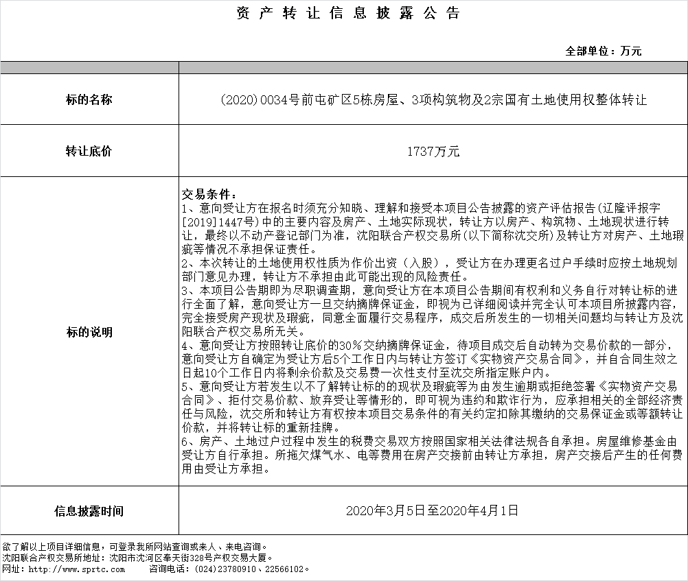前屯礦區(qū)5棟房屋、3項(xiàng)構(gòu)筑物及2宗國有土地使用權(quán)整體轉(zhuǎn)讓。