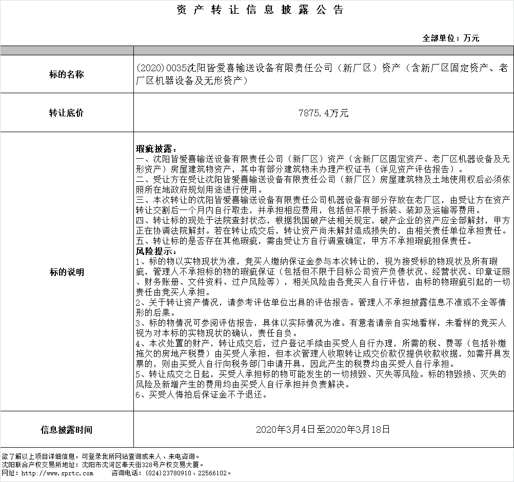 沈陽皆愛喜輸送設(shè)備有限責任公司(新廠區(qū))資產(chǎn)(含新廠區(qū)固定資產(chǎn)、老廠區(qū)機器設(shè)備及無形資產(chǎn))。