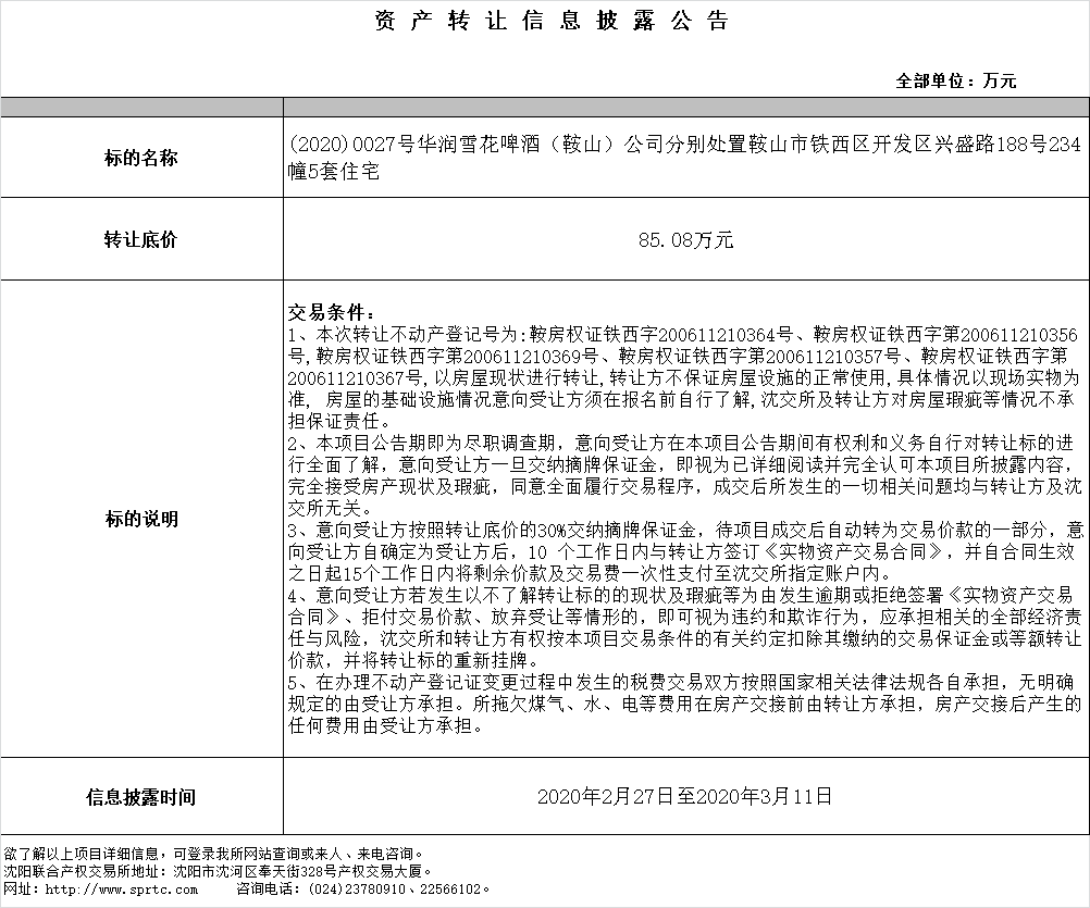 (2020)0027號華潤雪花啤酒(鞍山)公司分別處置鞍山市鐵西區(qū)開發(fā)區(qū)興盛路188號234幢5套住宅