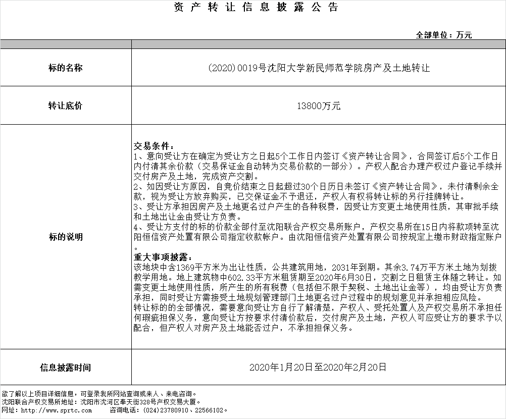沈陽大學(xué)新民師范學(xué)院 房產(chǎn)及土地轉(zhuǎn)讓。