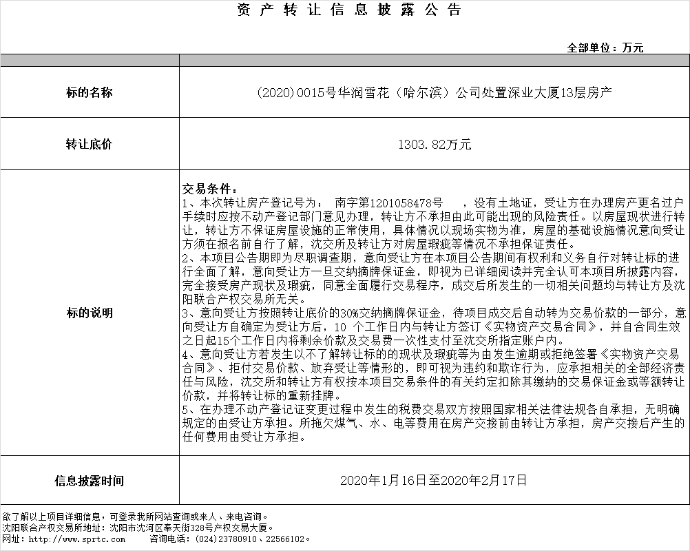 華潤雪花啤酒(哈爾濱)公司處置深業(yè)大廈13層房產(chǎn)。
