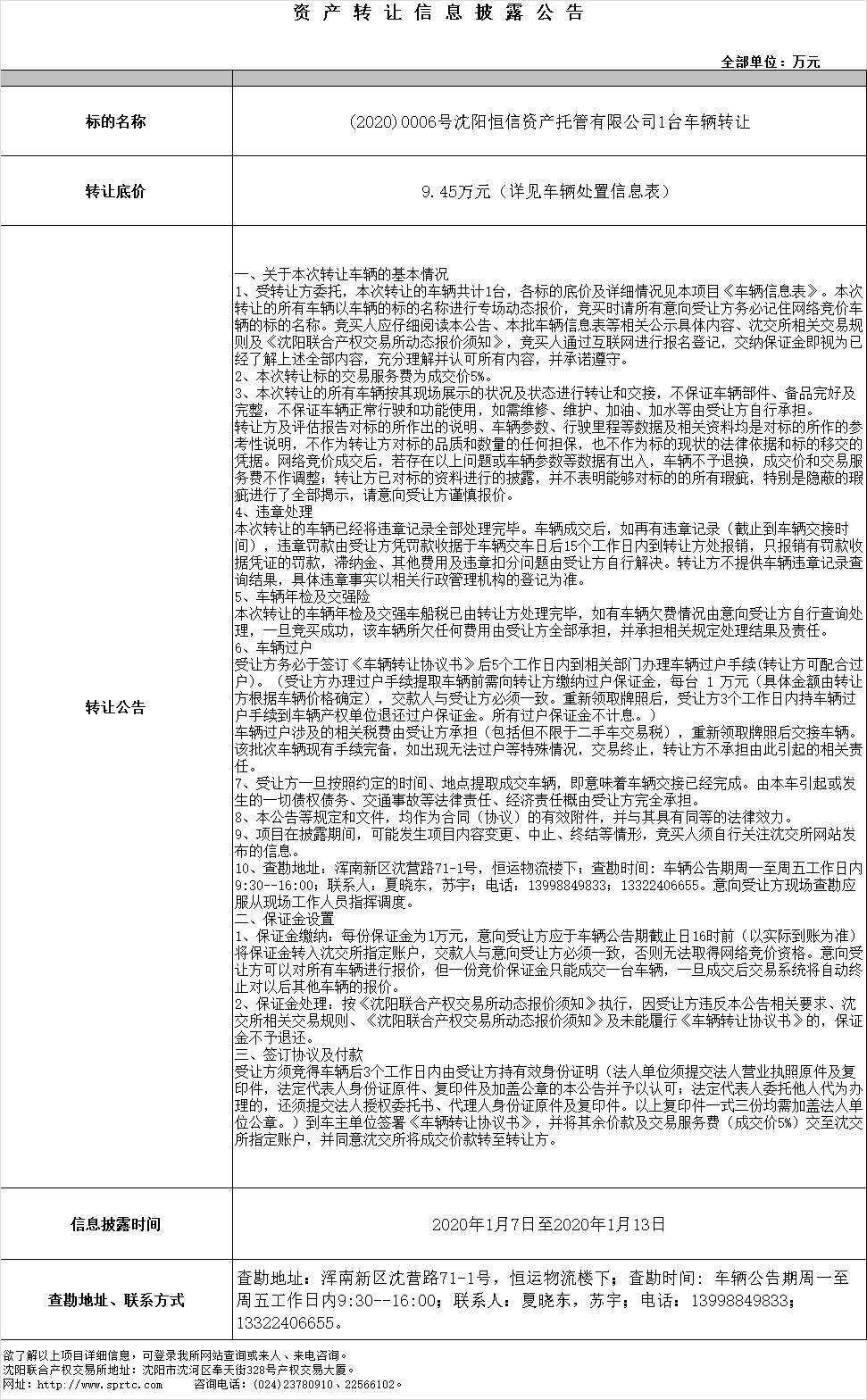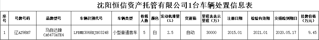 (2020)0006號(hào)沈陽(yáng)恒信資產(chǎn)托管有限公司1臺(tái)車(chē)輛轉(zhuǎn)讓