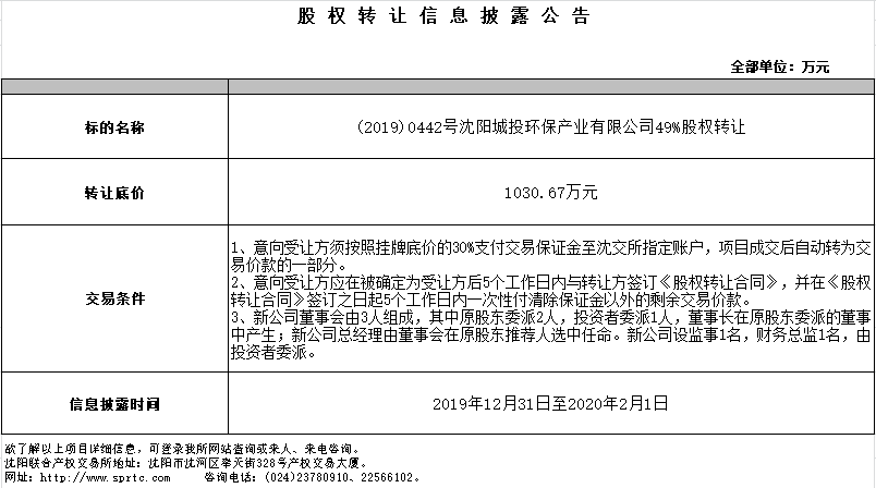 沈陽(yáng)城投環(huán)保產(chǎn)業(yè)有限公司49%股權(quán)轉(zhuǎn)讓。