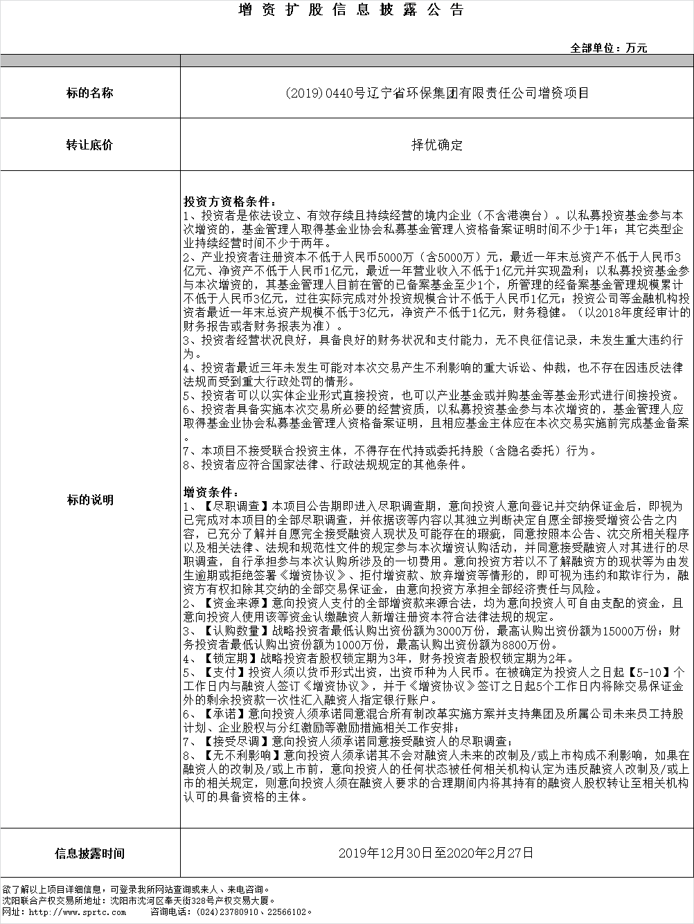 遼寧省環(huán)保集團(tuán)有限責(zé)任公司增資項(xiàng)目。