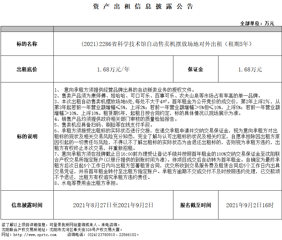 遼寧省科學技術(shù)館 自動售賣機擺放場地對外出租(租期5年)