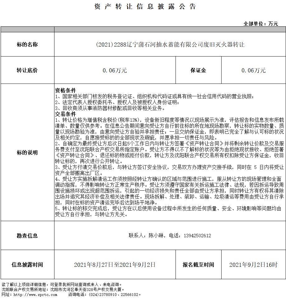 遼寧蒲石河抽水蓄能有限公司廢舊滅火器轉讓