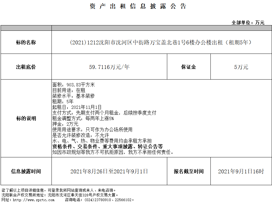 沈陽(yáng)市沈河區(qū)中街路萬(wàn)寶蓋北巷1號(hào)6樓辦公樓出租(租期5年)