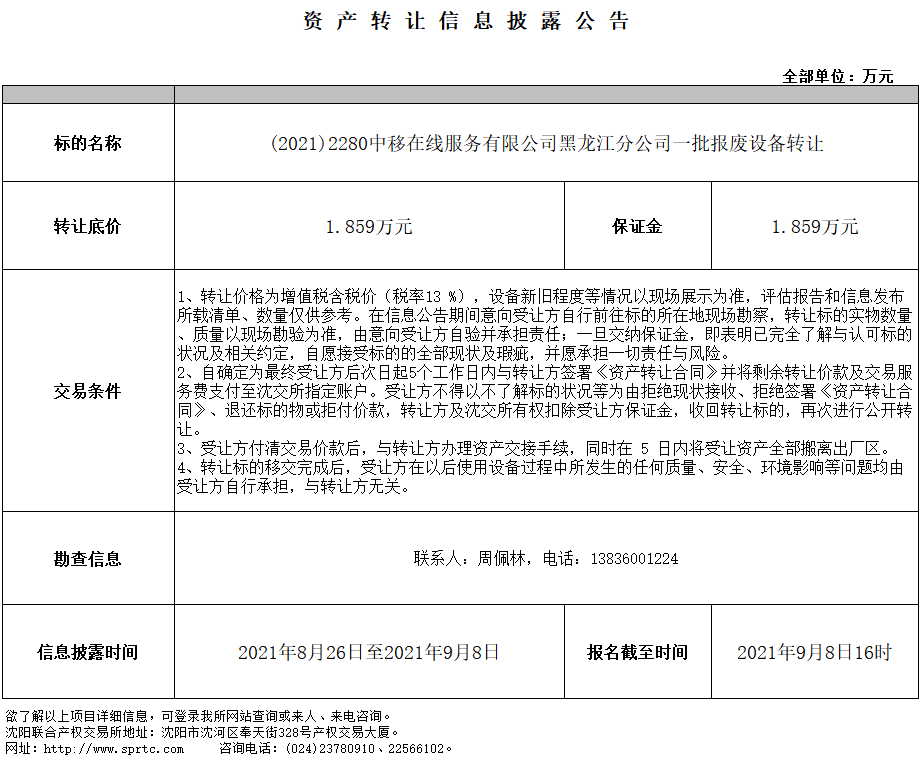 中移在線服務(wù)有限公司黑龍江分公司一批報(bào)廢設(shè)備轉(zhuǎn)讓