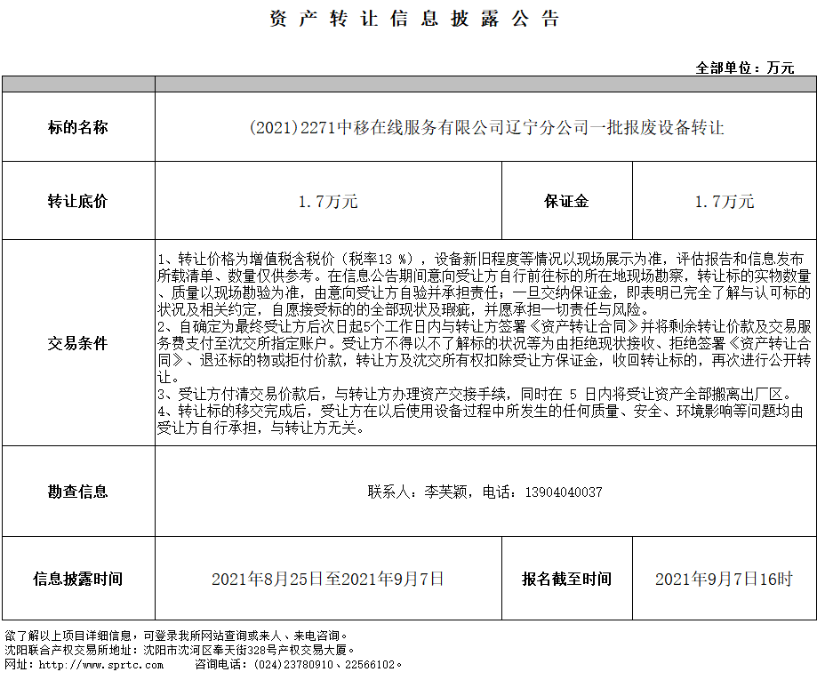 中移在線服務(wù)有限公司遼寧分公司一批報廢設(shè)備轉(zhuǎn)讓
