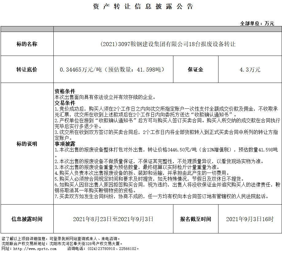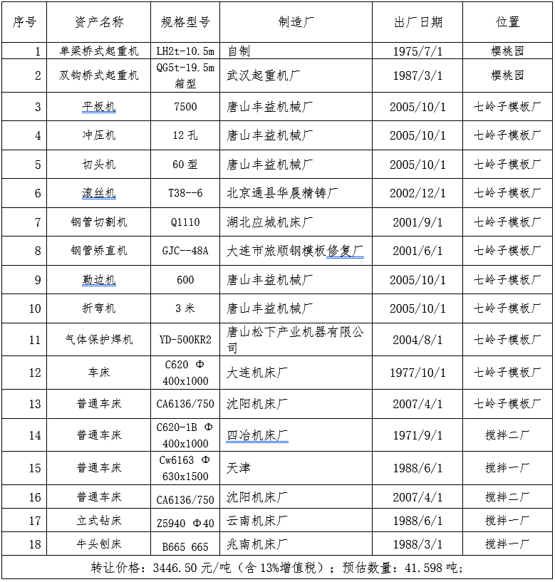 鞍鋼建設(shè)集團有限公司18臺報廢設(shè)備轉(zhuǎn)讓